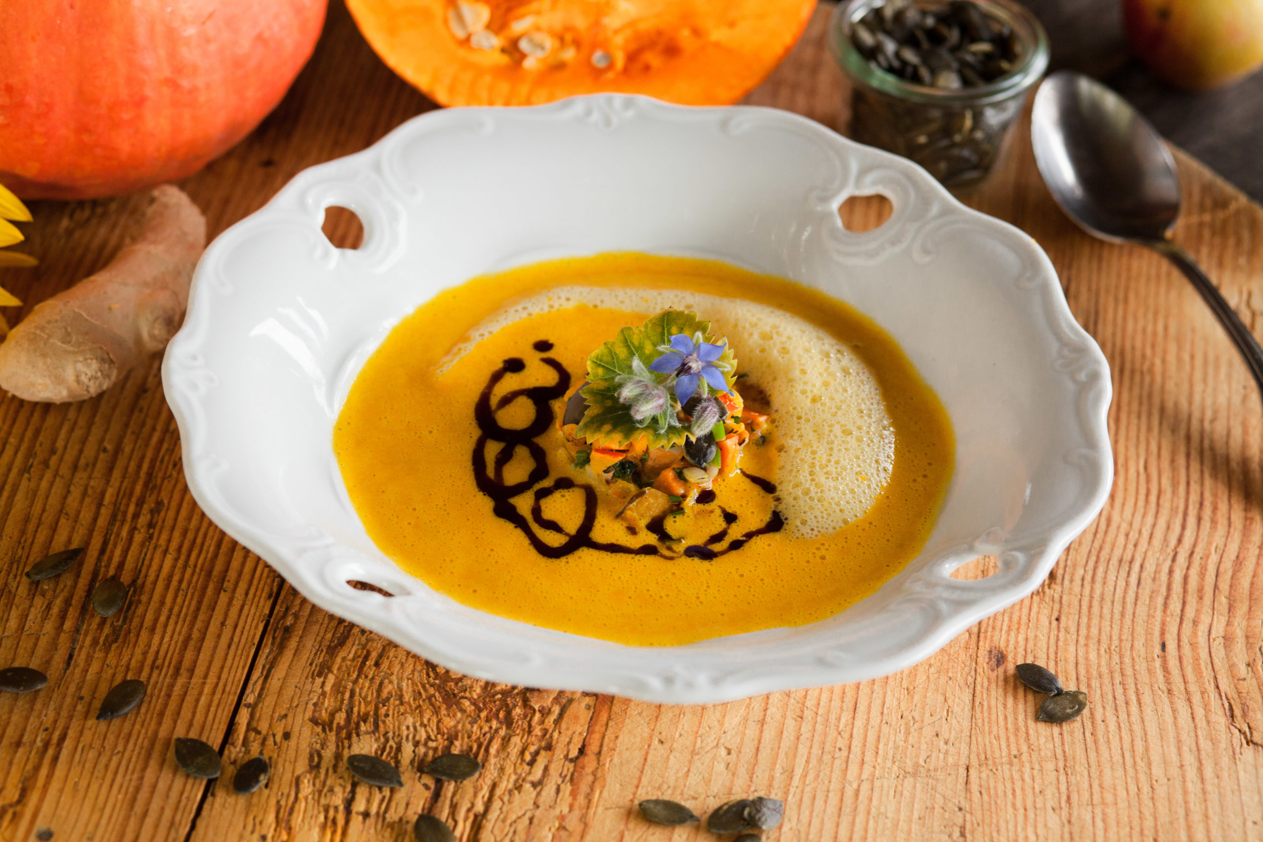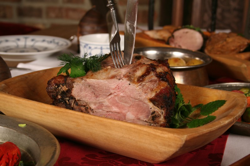 Es wird aufgetragen, ein Süppchen, verschiedene Braten, Gemüs und Salat und ein lecker Nachtisch.